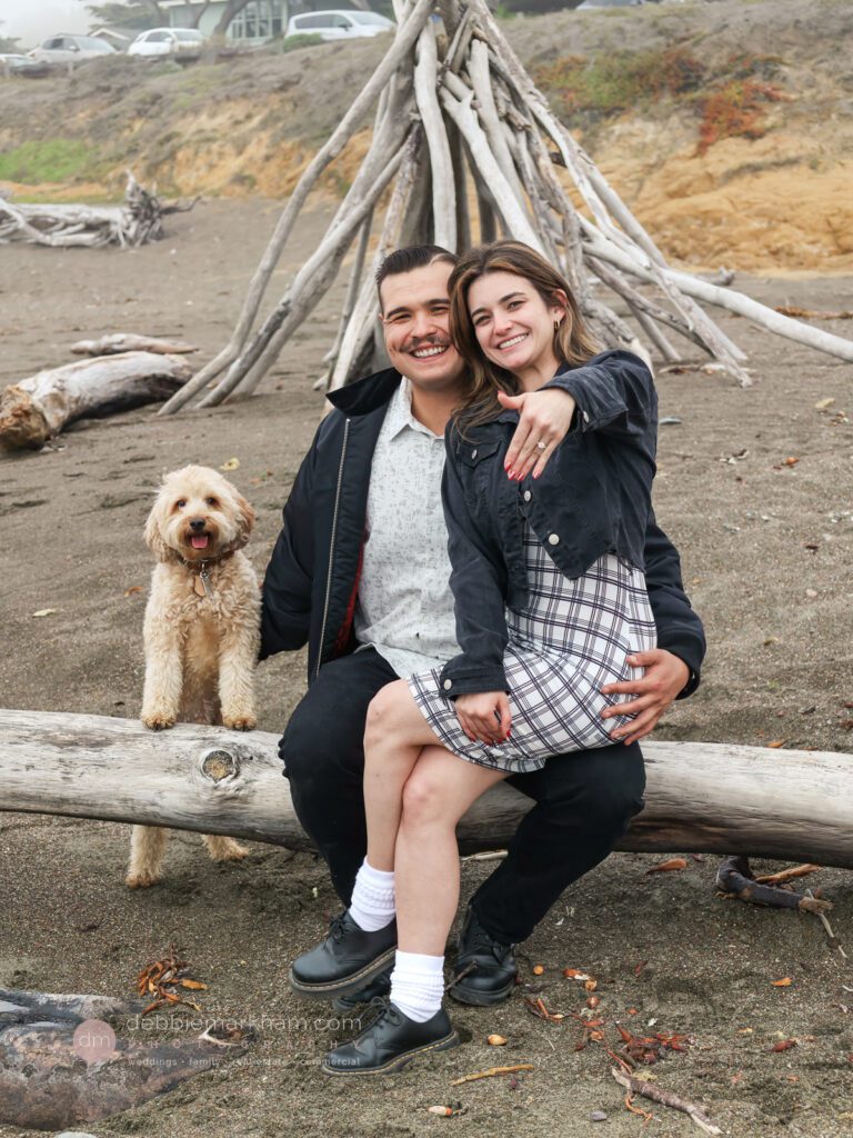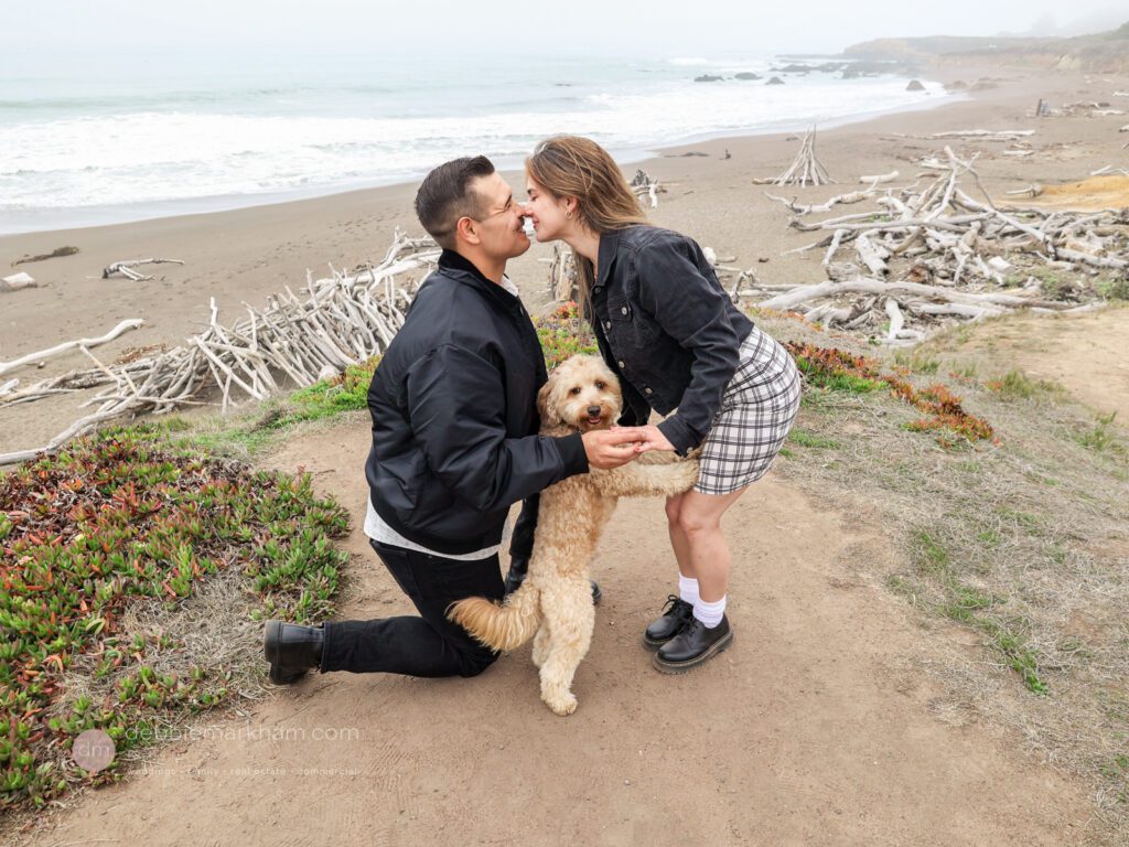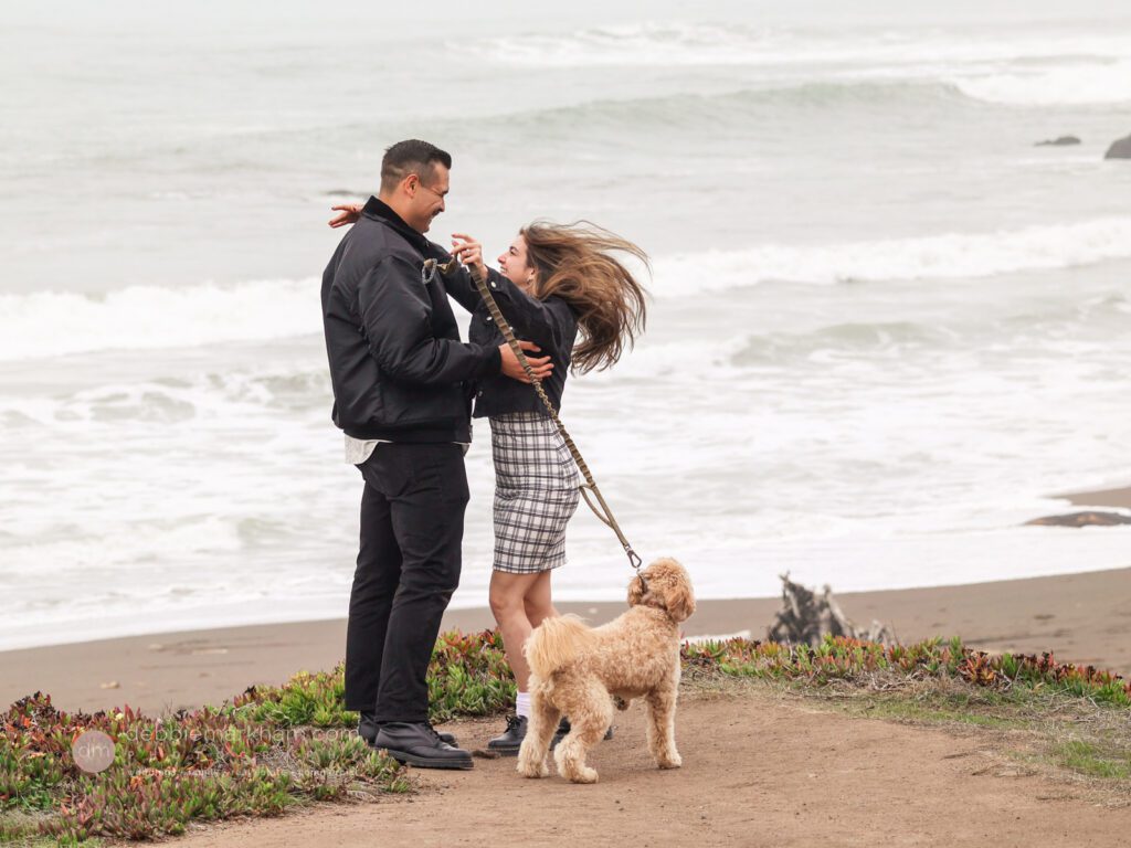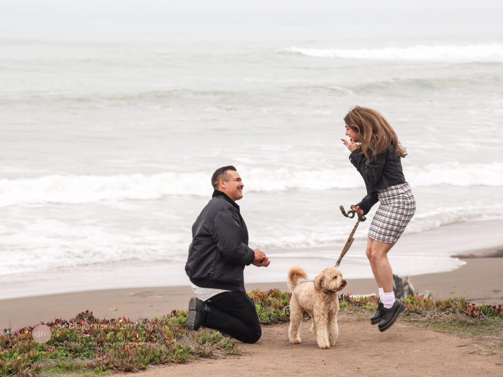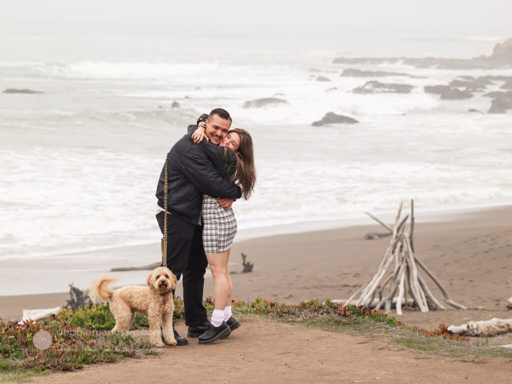 As they walked along the cliffside trail overlooking Moonstone Beach, Austin paused, knelt down, and held out the ring. Scrappy wagged and circled them, as Lauren literally jumped for joy!